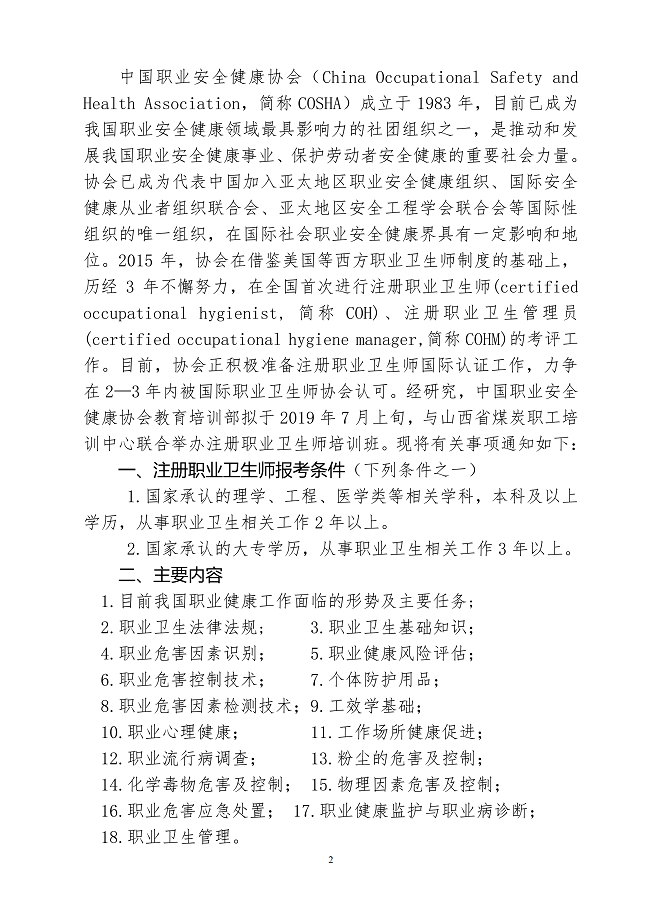 关于在山西煤炭系统举办注册职业卫生师培训班的通知
