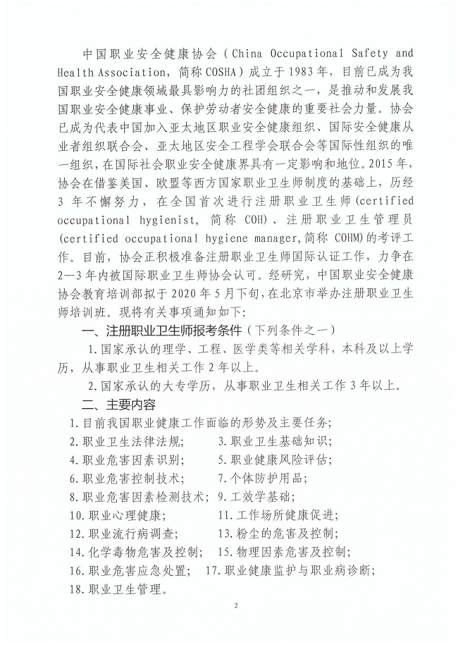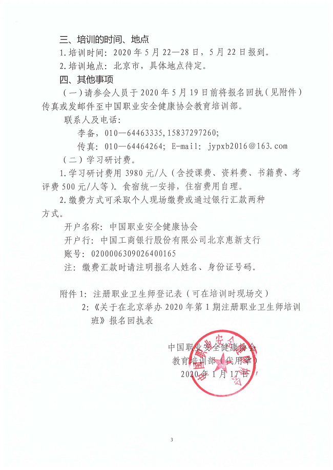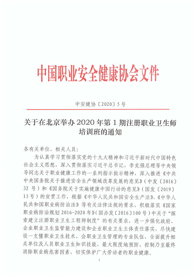 关于在北京举办2020年度第1期注册职业卫生师培训班的通知